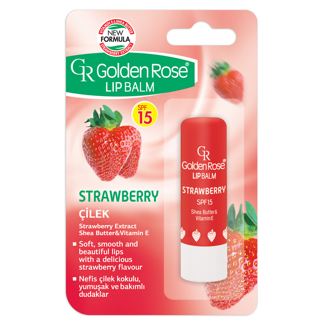 بالم لب توت فرنگی گلدن رز، یک محصول چند کاره با خواص مراقبتی و زیبایی برای لب است. رایحه توت فرنگی طعمی جذاب و درخششی قرمز رنگ بر روی لب ایجاد می کند. این محصول غنی شده با شی باتر و ویتامین ای است که پوست لب ها را آبرسانی کرده، مرطوب و نرم می سازد. همچنین ضد آفتاب موجود در این محصول محافظ خوبی در مقابل اشعه های مضر می باشد.