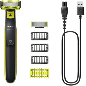 شامل دو عدد تیغه، پنج عدد شانه اصلاح، کابل شارژ USB و دفترچه راهنما.